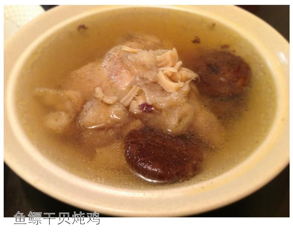 食材:甘榜鸡全腿、鱼鳔浸软、干贝3粒、花菇3个浸软、姜片数片、清水适量