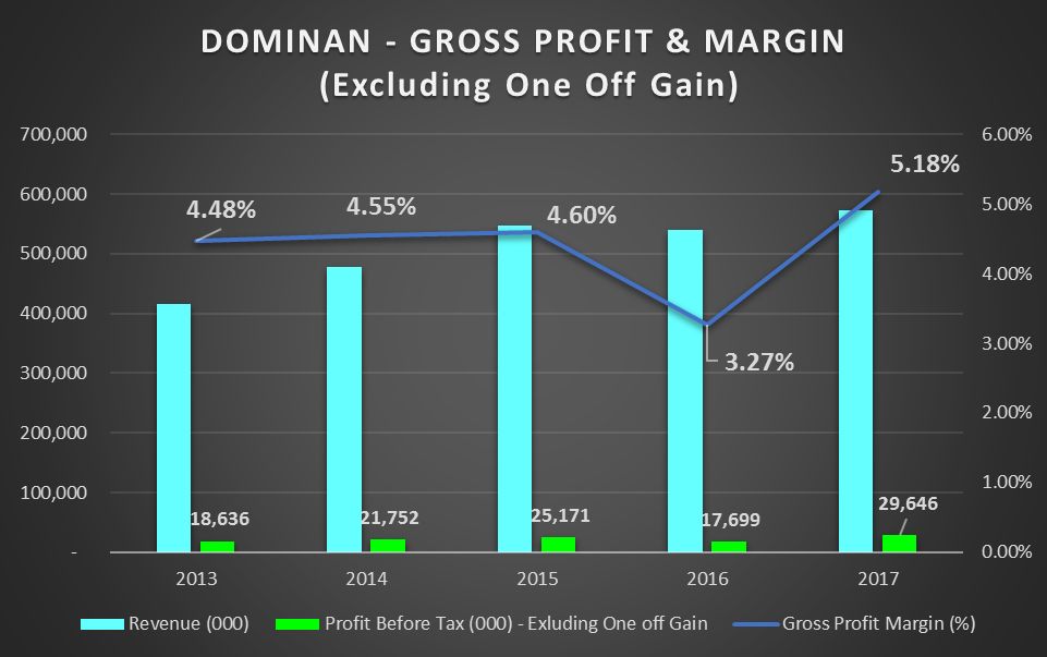 假设Exclude了FY14以及FY15的一次性盈利,大家可以看到FY2017的Gross Profit有了飞跃性的成长,Gross Profit Margin在5年来首次突破5.18%。。
