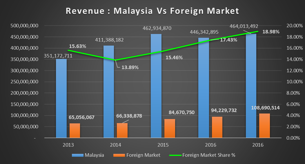 DOMINAN的其中一个目标是把出口营业额增长到20%,过去的3年都看到了明显的增长,FY2017已经增长到18.98%,距离20%的目标已经非常靠近。而且本地和外国的销售都保持稳健的成长,预计FY2018可以突破全年RM600 mil的营业额。