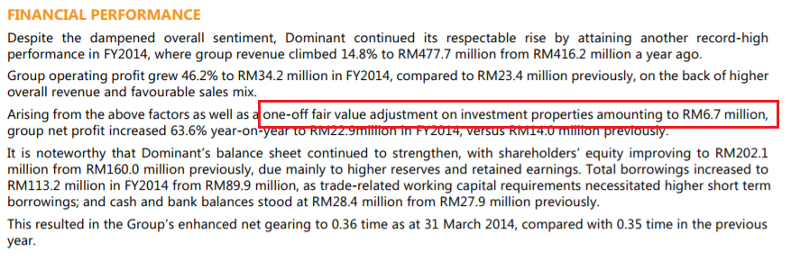 FY2014因为RM6.7 mil的One off fair value adjustment on Investment properties而导致盈利大增。
