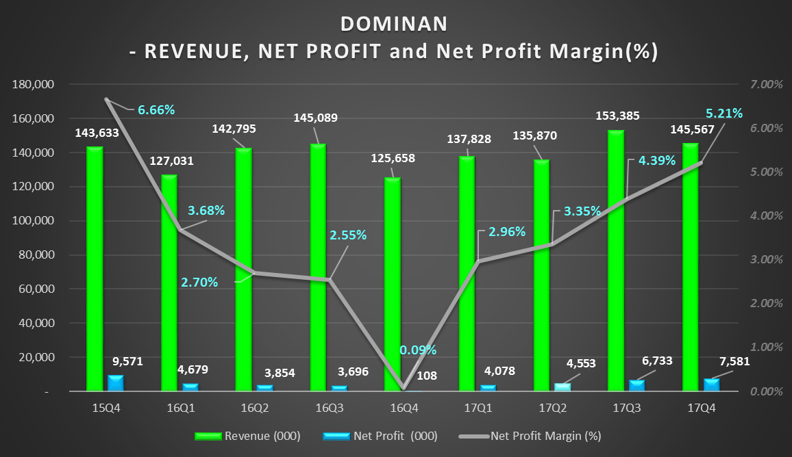 DOMINAN的营业额处于上升的趋势,Net Profit Margin过去4个季度节节高升,而Net Profit已经连续4个季度QOQ成长。