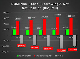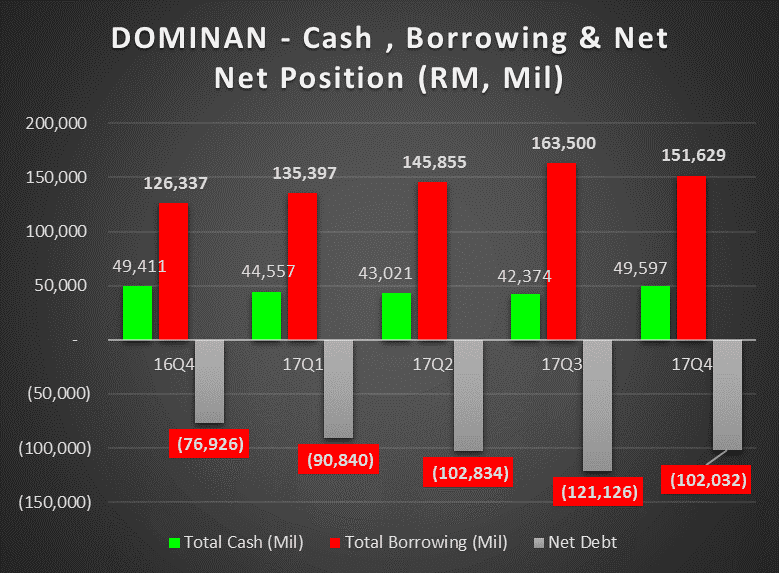 DOMINAN的债务从16Q4的RM126.337 mil一直增长到17Q3的RM163.5 mil,这些借贷都是用在建设扩张新厂。不过大山脚的新厂预计接近完工或已经开始贡献盈利,所以FY17Q4的现金以及债务都了有了非常明显的改善,Net Debt Positon从RM121.1 mil下滑到RM102.03 mil。