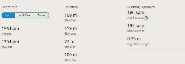 最后完成时间是1:15:14,平均配速5:57。步频平均189没有太多或少,心跳平均184,如果是183会更理想。表现满意程度90%!没有达成目标1,但是如果扣除650m,基本上是达成了目标2。