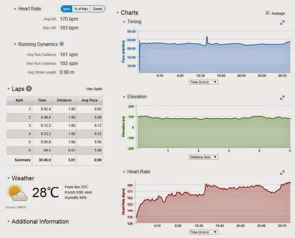 今天跑的感觉很轻松,即时跑得比平时快,但是我不觉得喘,所以没有慢下来。虽然我知道心跳都已经180左右了,但是没有感觉任何的痛苦。当我看到第一个水站时,我才发觉自已已经跑了接近3公里。没有在这个水站补充水分,因为觉得没必要。2KM - 5:47, 3KM - 5:53。