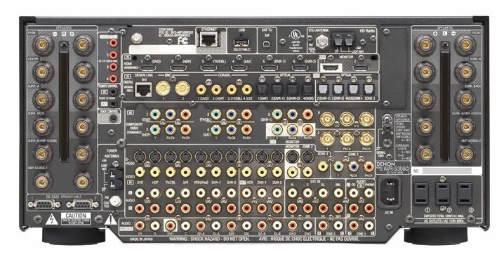 ●輸入/輸出端子︰HDMI輸入端子6、HDMI輸出端子2、Toslink光纖輸入端子5、Toslink光纖輸出端子4、數位同軸RCA輸入端子4、數位同軸BNC輸入端子2、身歷聲輸入端子11、身歷聲輸出端子5、7.1聲道類比訊號輸入端子1、9.3聲道前級輸入端子1、Denon Link輸入端子1、網路端子1、無線網路天線端子1、iPod Dock端子1、USB端子2、Composite Video輸入端子8、Composite Video輸出端子5、S-Video輸入端子8、S-Video輸出端子5、色差端子輸入6 、色差端子輸出3、FM/AM天線端子各一、喇叭端子11