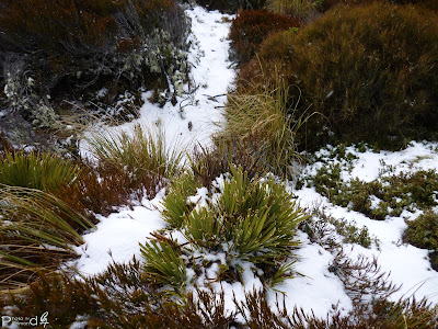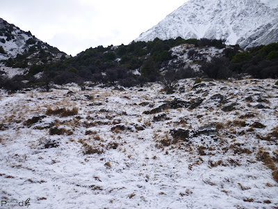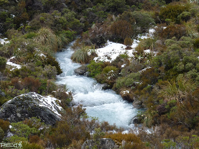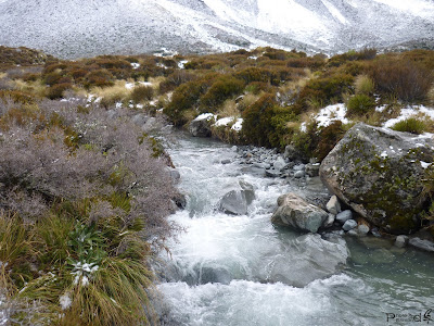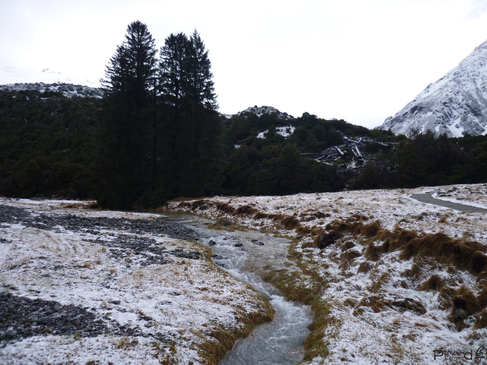 虽然下了雪后的景色真的很漂亮,但也因为之前的坏天气,Hooker Valley Track的步道难度提升了。根据之前有走过相同步道的Ruth姐说,现在我们看到的小溪,很多之前都是步道,但因为连日的大雨和下雪,现在步道都成了小溪。由于部分步道都成了小溪,如果不想弄湿鞋子的旅客就必须尽可能的找到较高的地方来越过这段步道。我们曾经因为真的走不到一条可行的路径而差点放弃啊。。。最后,我们当然是找到了一条可以不弄湿鞋子而前进的路径,哈哈,这些都难不倒我们的!!!过了这段步道,后面的步道就没有遇上类似步道变成小溪的难题了。好了,继续前进。
