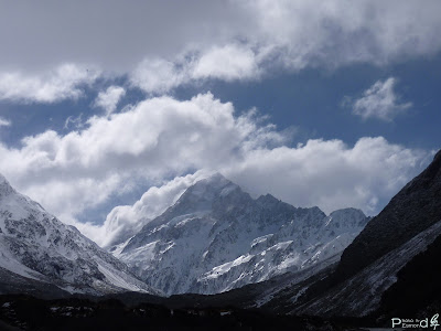 就这样的一路走一路拍照,渐渐的我们就走到接近第二座吊桥。这时候,从步道远远就看到那座闻名已久的纽西兰最高山--Mount Cook啦!!!由于在山的那一边的天气真的很多云,我还真的没有啥机会可以看到清楚的Mount Cook顶峰。。。