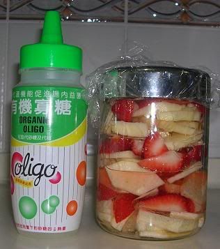 想弄点酵素给孩子喝, 又怕酒精, 就买了寡糖. 本来想做苹果的, 刚好看到便宜的有机草莓, 就掺了, 希望味道会好(好像拿孩子来做实验 ).