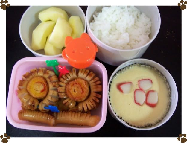 今天的便当有蒸水蛋,香肠,蟹柳,炸鸡块(在香肠下面看不到)和苹果