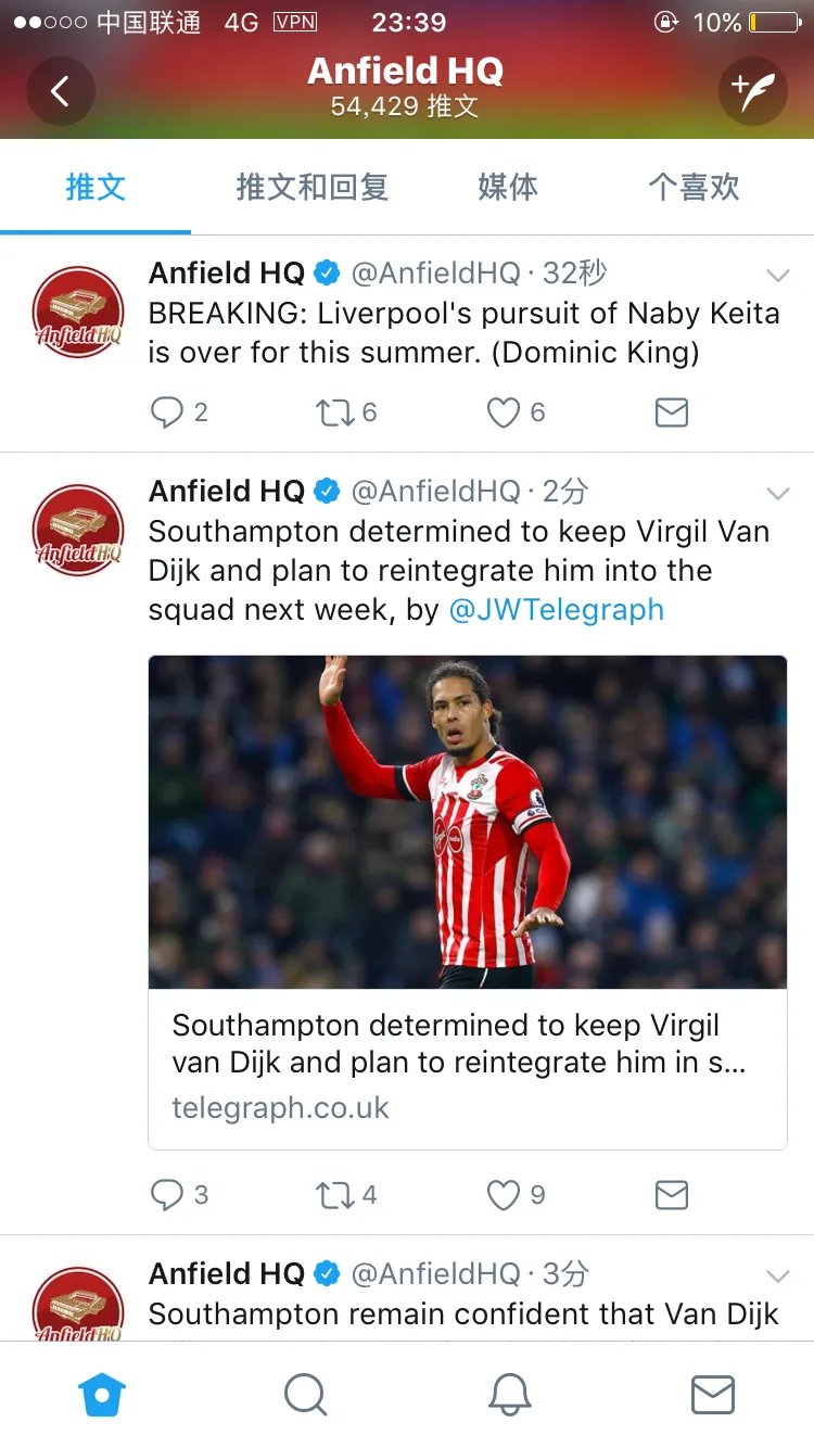 小道消息,消息源和早上说老乡会和利物浦在这个下午会面的是同一个消息源,这个消息源一个小时前说,范迪克转会利物浦已经完成,转会费最高可达68M英镑。