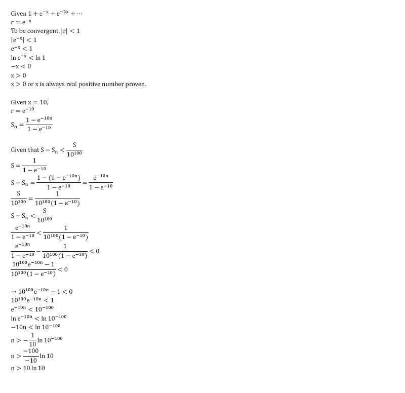 Show that the geometric series 1+e^-x+e^-2x+... converges to S, a sum to infinity for any positive real number x. Given that x= 10, write down expression for Sn,the sum to n terms for S.