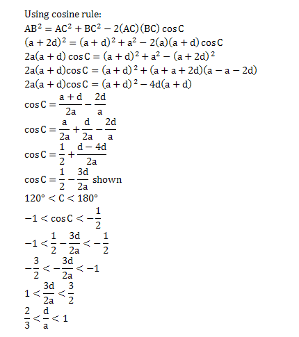 The sides BC, CA, AB of a triangle ABC are a, a+d, a+2d respectively. Show that cos C = 1/2 - 3d/2a.