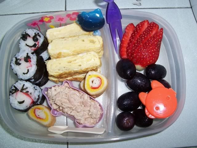 今天的便当有蟹柳寿司,厚蛋烧,Tuna,葡萄和草莓。。。