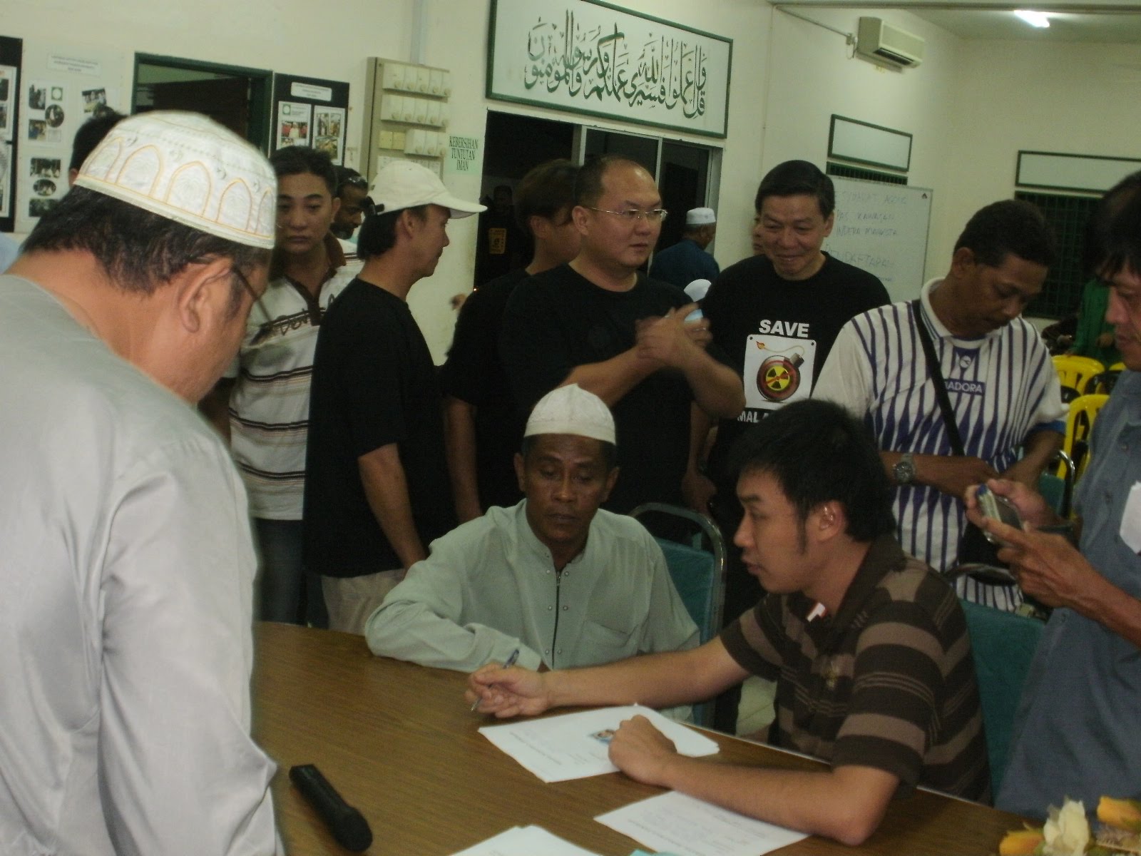 [Selepas majlis dialog, pihak peguam terbabit telah mengedarkan borang untuk diisi oleh rakyat terutamanya di sekitar kawasan yang berisiko besar hadapi ancaman radioaktif yang bakal dikeluarkan oleh kilang tersebut. Borang yang diedarkan telah habis sekelip mata dan terpaksa dicetak semula oleh pihak berkenaan. Sesungguhnya, rakyat tetap mahu memastikan Lynas dinyah keluar dari bumi Kuantan buat selama-lamanya. Dalam pada itu, kita juga terkejut apabila pihak peguam terbabit melaporkan mereka kecewa dengan tindakan media arus perdana terutamanya yang berbahasa Melayu gara-gara tidak menyiarkan kenyataan media yang dibuat oleh pihaknya ketika mesyuarat khas baru-baru ini. Satu resolusi telah dibentuk untuk membantu rakyat dalam menangani isu tersebut. Difahamkan hanya akhbar Sinar Harian, akhbar berbahasa Cina dan Inggeris sahaja yang menyiarkan kenyataan media itu. Turut hadir ialah Ustaz Nasron (YDP PAS Indera Mahkota), Andansura (Timbalan Ketua PAS Indera Mahkota), Ustaz Suhaimi (Naib Ketua PAS Indera Mahkota) dan beberapa lagi yang lain]. |
