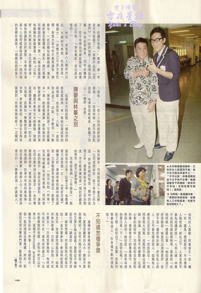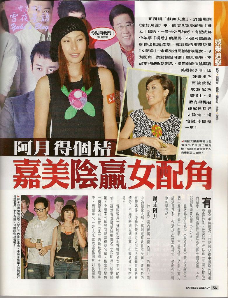 有報道今年無铫頒獎禮改制,令原為大熱門的楊怡無份提名?楊怡說﹕「我不知道,亦不會失望,其實我都想菊姐、司棋姐一齊?獎,我未有資格,重要浸纒。」而菊姐坦言恨?獎,她說﹕「獎項是一個肯定,個個都想?,但我不會想太多,否則好辛苦。」