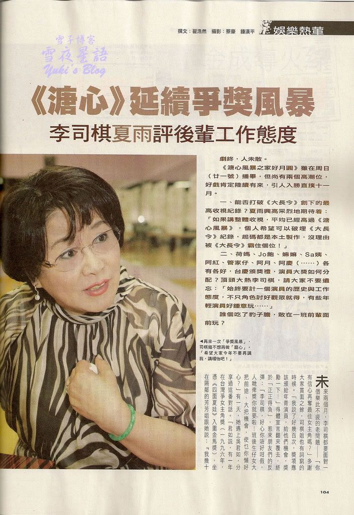 司棋姐對於《家》劇獲得高收視,她開心道:「我開心到跳起,今年是最開心的一年。(會否慶祝?)可能,但不知道那些年輕人會否得閒?(有否增加你對視后獎的信心?)我沒想這些,能夠成為一分子已經很開心。」提到早前有醫院斷錯症,將一名沒有乳癌的女士割去一邊乳房,司棋姐表示聽到消息也不禁搖頭嘆息,因為毀了別人的一生,但又不可以說對香港醫療失信心,相信是管理上出現問題。對於陳志雲表示不會開拍《溏心》第三集,司棋姐也覺得爭產故事已飽和,應是時候要停一停。她又道:「今天對我來說,到我老、合上眼睛時亦會開心,值得回憶。(但會否失落?)不會,因為稍後《珠光寶氣》會出街。」