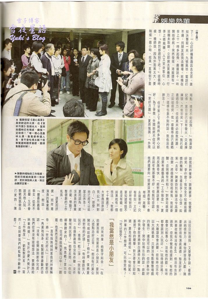記者昨日致電準備返加國的夏雨,其手機已飛回加拿大的家,並由太太馬慧玲接聽,她表示老公知道《家》劇高收50點後,已急不及待致電回家報喜。她又大讚老公於劇中的表現,認為他今年應癦獎:「佢演得好投入,今年男主角獎應該要畀佢,上年佢冇獎我都有皷失望。」