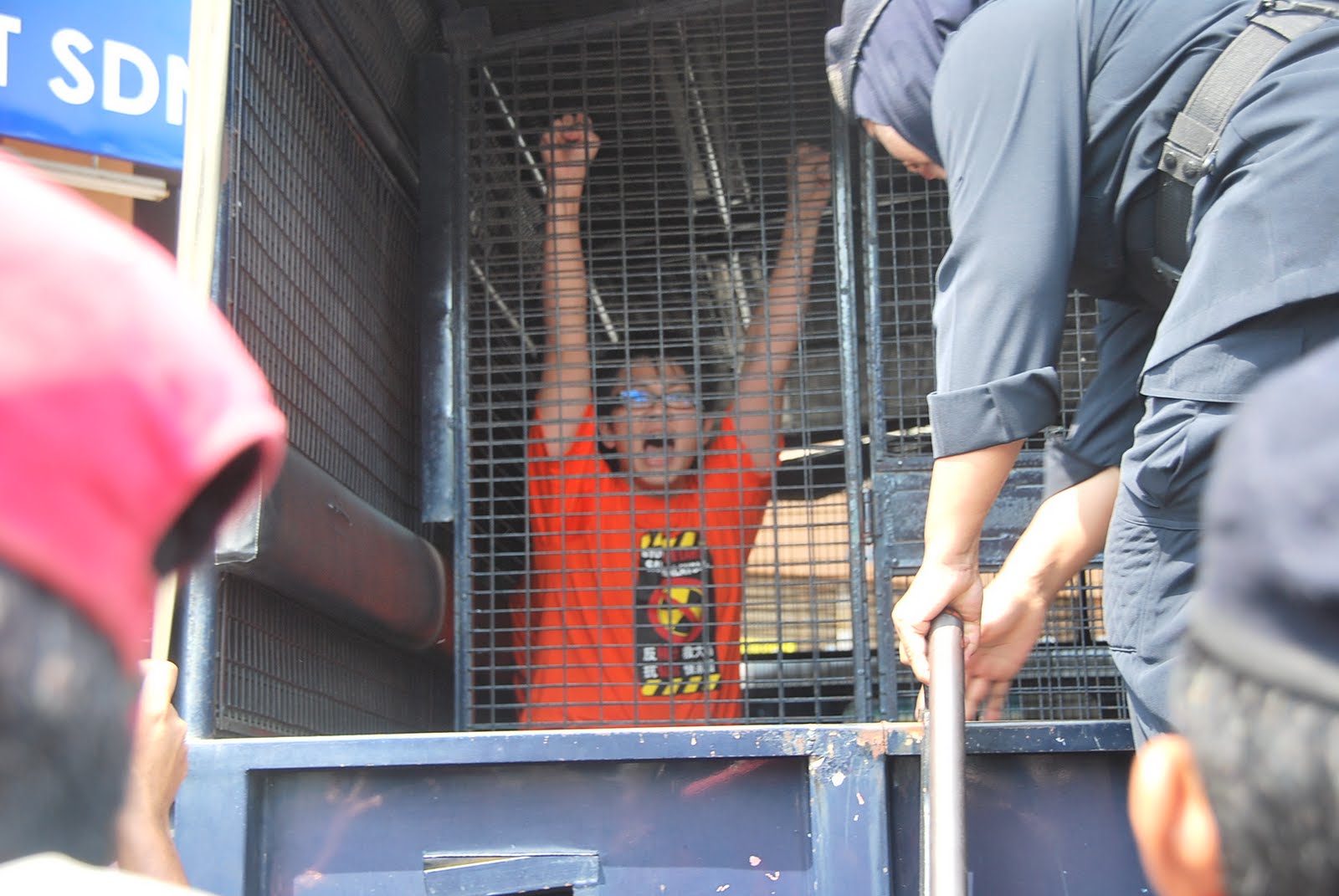[size=85%]A[size=85%]ktivis yang ditangkap dimasukkan dalam trak polis untuk dibawa ke balai