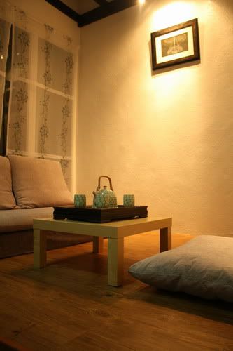 哈哈哈。。。有禅味吗?我们全家都爱这个茶坊了!白天阳光照进来,亮度刚刚好,家公喜欢在这里看报纸。下午孩子们喜欢在这里吃点心。傍晚下雨时,坐在这里听雨声也很写意。晚上开了黄灯,我和老公喜欢在这里谈心。是不是很赞? |