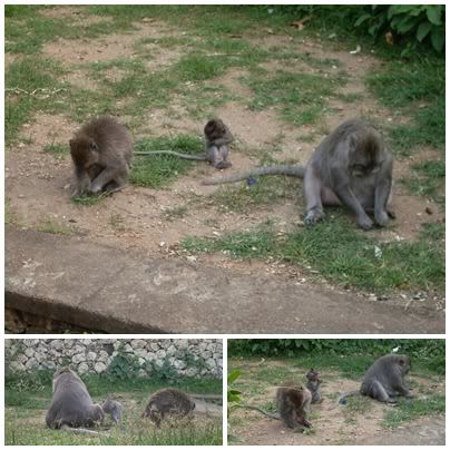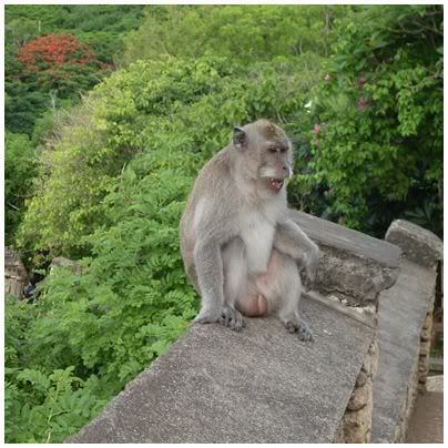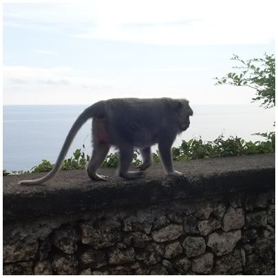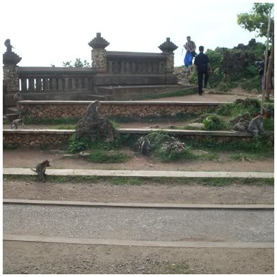才不到十分钟的路程我们就到了Uluwatu。入门费只是RPH3k(RM1.11)一个人。进去也是要包Sarung。当然,眼镜,发夹,耳环,手链,项链,帽子,所有带在身上的都要收起来。不然,等下猴孙会去拜访你呢。{:2_76:} 这里的猴孙果然不是盖的,还没进到去,就有一只猴子爬在一个日本妹背后抢了她的帽子。顿时,紧张气氛就来了。一直注意周围的动静。Nyoman也有一直帮我们注意周围的猴子。 一眼望去,真的好多猴子。