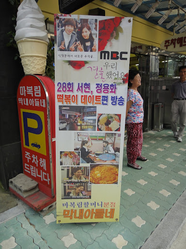 在外面转了一圈,肚子开始饿了,不知什么时候养来11点吃午饭的习惯,肚子老早就饿了。但是首尔的这两位“亲故”说要带我吃在景福宫附近有名的土俗村参鸡汤。这个土俗村参鸡汤早略有所闻,这么有名价格一定不便宜,一个人也不打算去吃,现在人家邀请不空腹去还是人吗?话锋一转,我已经坐在一家卖简单食品的小店里,都是一些卷饭、方便面的东西,恰好可以稍微垫一点。要了个卷饭,其实就是寿司卷,至少照片上看是如此。菜一上来,跟我的胳膊一样粗,又饱了……发现韩国用来“吃粗饱”的食物真的会撑死人。 日本寿司卷吃精致,韩国卷反吃粗饱,只要2000韩元左右,主食里算是能找到最便宜的食物了。