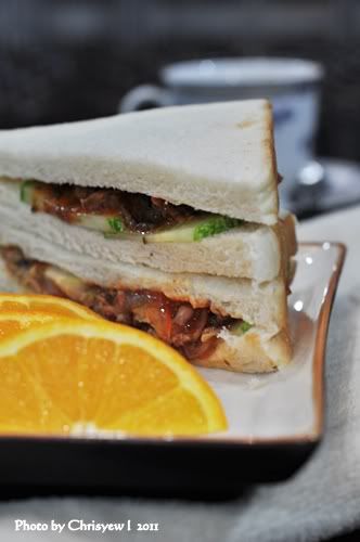 材料 - 面包 有机番茄 有机黄瓜 沙汀鱼少量 一杯醒神的咖啡 水果数片(自己喜欢)