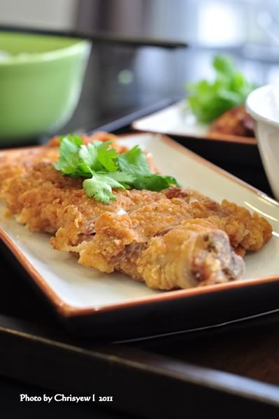 方法 - 鸡腿两面各用刀背来去敲一敲 两面沾上蛋清和炸鸡粉放下热油中炸至金黄即可上桌