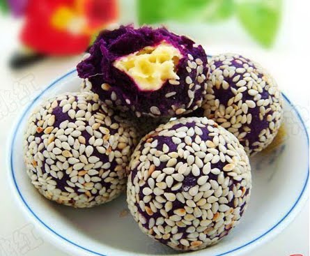 7、将团搓好的紫薯球放芝麻中滚一圈,粘上芝麻。