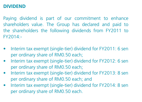 截至去年底,它保留了7805万令吉的盈利,较2013年的7027万令吉为多。该家现金充裕公司在2011及2012年分别派息6仙,而在2013和2014年则分别派息8仙。