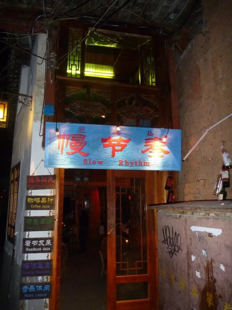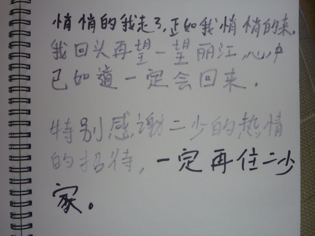 Day 8 早上醒来何姐问我们今天要去那里,我答要去束河古镇,何姐说那好我叫我朋友载你们去。何姐很好人怕我们给司机骗,因为现在是淡季束河古镇都不收费,司机会骗你说帮你逃票走后面的小路,然后向你收一人RMB5-RMB10的逃票费。不过何姐的朋友电话打不通,我说那我们搭巴士,何姐说好到大水车那里搭11路巴士RMB1元在束河路口站下车。 和老婆先去七一街附近吃早餐,早餐后又悠闲的走在古城的小巷。老婆这时突然说:不然等孩子长大了,我们在这里开间小店,反正这里的生活这样悠闲,我笑笑不答,梦想与现实,人们通常都被现实打败的。 走着走着就经过激沙沙客栈,和老婆很有默契的游进了二少的家。照旧,普洱茶招待即使没住他家。二少问梅里雪山好玩吗,我们答好玩,景色好美但路途太艰苦,不会去第二次了,除非只去香格里拉。二少露出不解的表情说到:有那么严重吗。聊了近一个小时,二少叫我在留言簿留言,还跟我换了RM10贴在留言簿上。 字太丑了但还是跟大家分享。