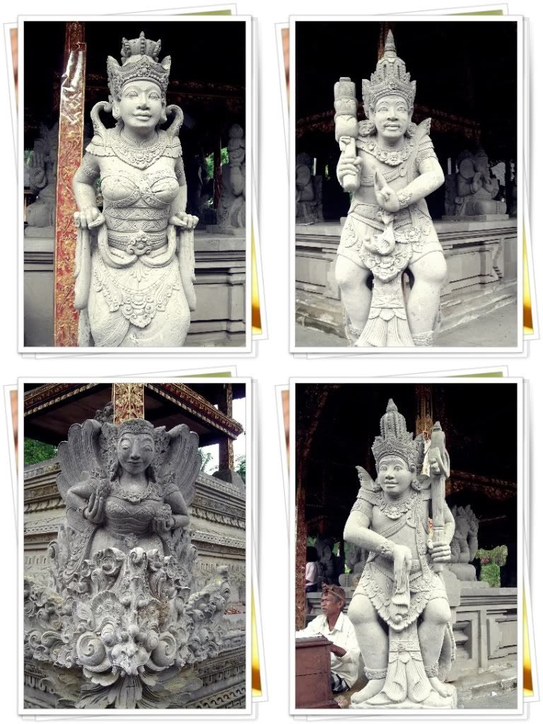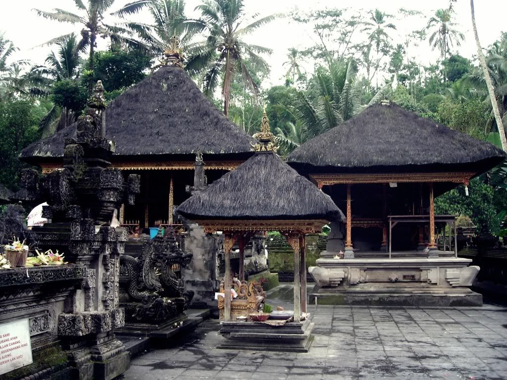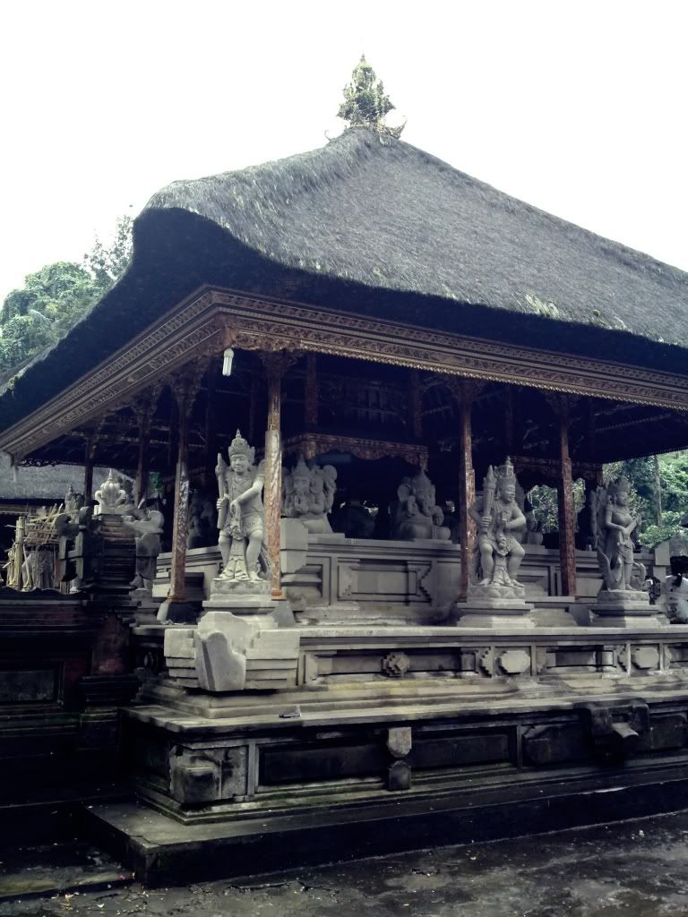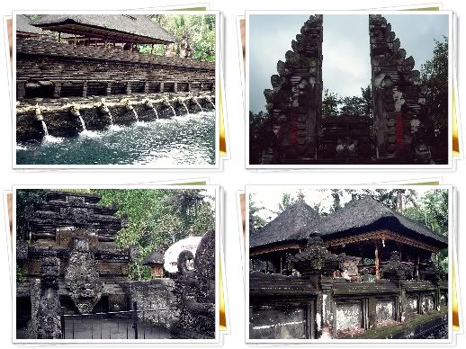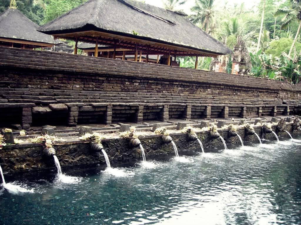 聖泉廟蠻大﹐經過前院的大石像(像是保護聖泉廟的大使者)再到一個養了許多鯉魚的大魚池﹐才到達他們的聖泉池 : 这里的泉水据称颇具疗效,讓當地族人清洗身體﹐希望洗掉不好的東西并带来健康和财富。然後再進入內堂祈禱並祈拜的廟堂。他們的廟堂外形都是類似 “一層接一層的塔” ﹐顏色鮮艷﹐屋頂類似黑色的草編織成。廟裡﹐常看見: 貌似龍頭﹐露出兩顆尖牙﹐手拿著不同的法器﹐像我以前看過的 “四大天皇” ﹐還有一位面帶笑容的女神﹐帶給我一種很神秘的感覺。