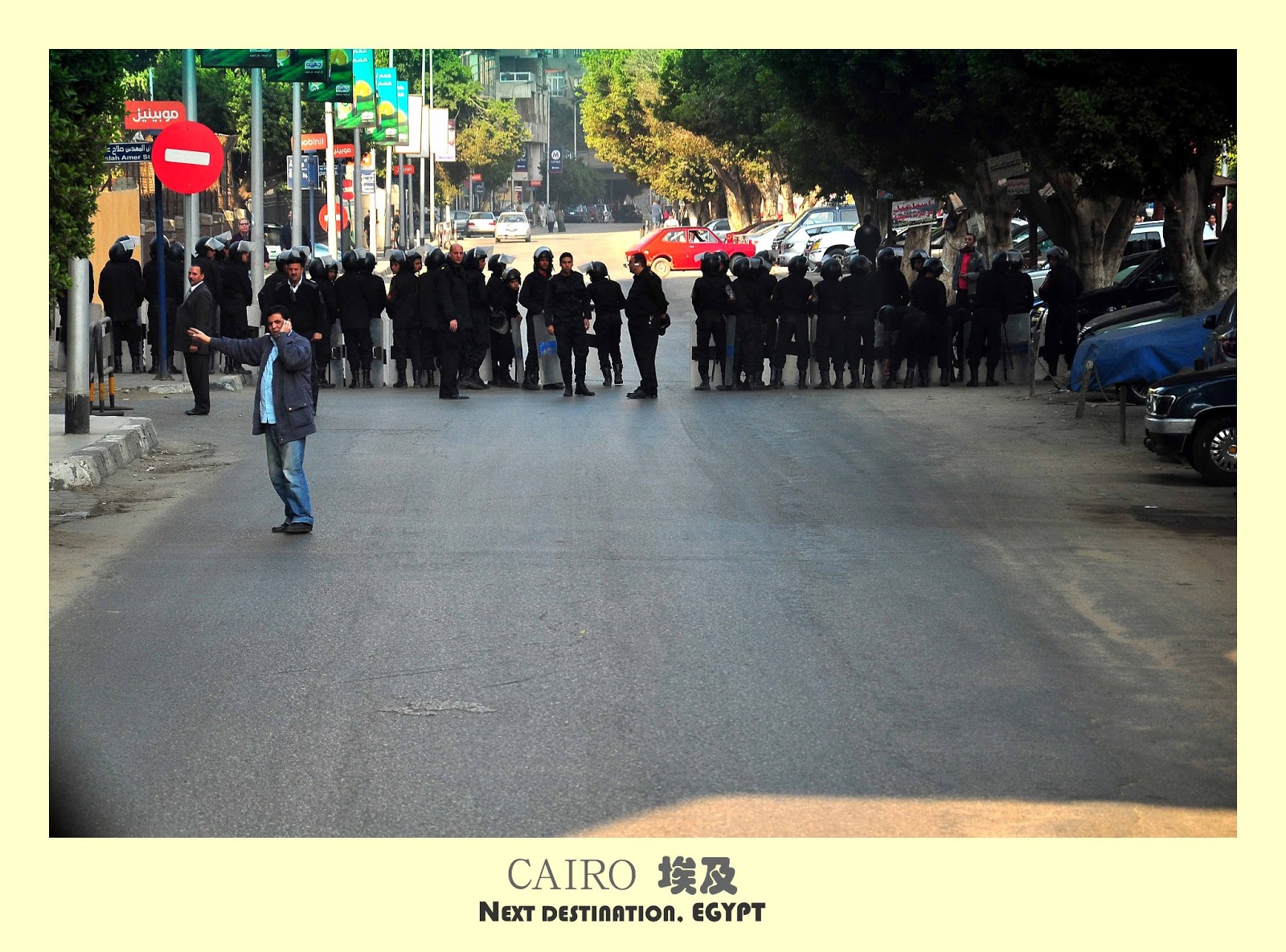 就在我嘣嘣乱跳的心平复时,我们的巴士司机却突然把巴士停了下来。坐在最前头的我,一看之下,不禁吓呆了。怎么前头也有镇暴警察?街头街尾早被镇暴警察所包围了。本来拥挤不堪的埃及公路,一时间冷冷清清,看不见任何一辆车。所谓山雨欲来风满楼,我的脑海里不时出现暴徒把我们的旅游巴士掀翻的画面。然后我的名字出现在新闻头条。。。。。。