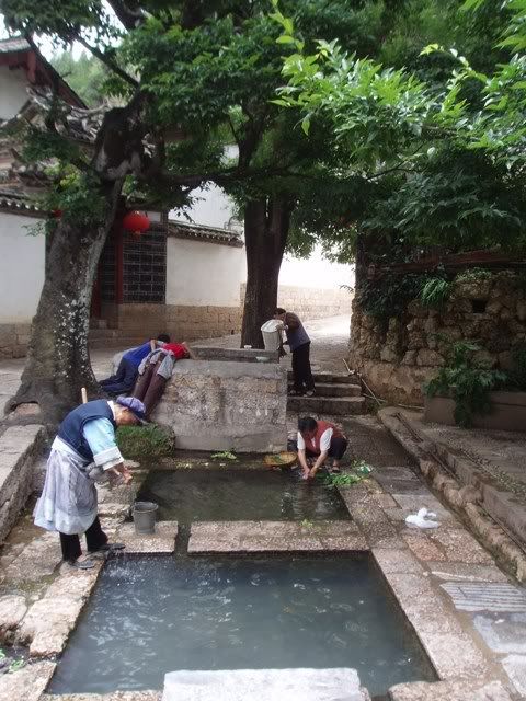 我们接着走到附近的“三眼井”参观。 这个丽江古城的习俗一直流传到现在,最上面的那口井是来饮用的,第二口是洗菜的而最下的那口井是洗衣服或地拖的。 在丽江有几十口这样的三眼井。