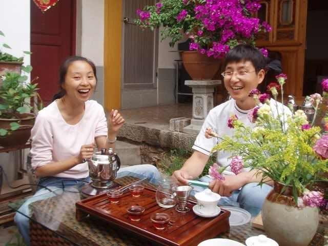 喝了咖啡后我们看了一会儿新闻就下楼去,打算到四方街报到。 下楼后东宁看到我们很高兴得说,“你们在家啊?我买了茶具,来来来,一起来喝茶。” 一行四人坐下来从普洱喝到铁观音,又聊得不亦乐乎。 这时候,有两位二十出头的女孩来看房间,我不禁笑起来,“东宁,你挂招牌没生意,拿下来后生意自己找上门!”