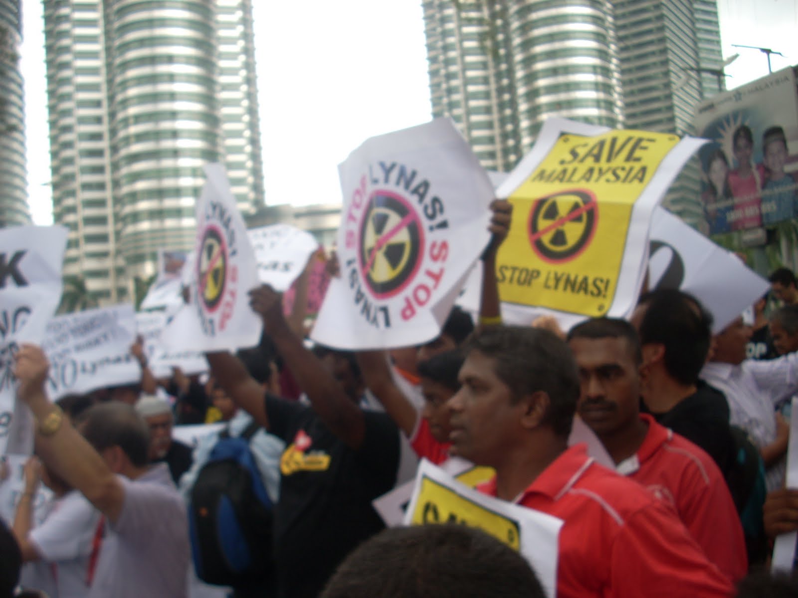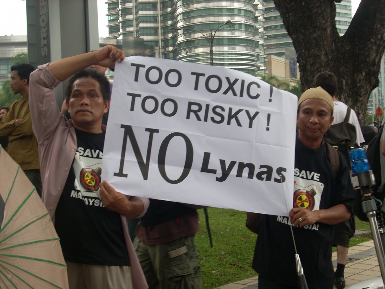 KUALA LUMPUR, [size=85%]20 Mei - Ratusan orang berhimpun bagi membantah pembinaan pusat pemprosesan nadir bumi bernilai RM700 juta di Gebeng, Kuantan yang dimiliki syarikat Lynas yang berpengkalan di Australia. Mereka yang terdiri daripada anggota Pemuda PAS, PKR, Parti Sosialis Malaysia (PSM), NGO dan aktivis sosial itu mengadakan perhimpunan di hadapan Pesuruhjaya Tinggi Australia di Kuala Lumpur. Sambil mengiringi enam wakil mereka untuk menghantar memorandum bantahan berhubung pembinaan pusat itu yang dikatakan akan mengeluarkan bahan radioaktif yang boleh menjejaskan kesihatan penduduk sekitar Gebeng di negeri itu. Mereka juga membawa pelbagai sepanduk, poster dan kain rentang yang menuntut kerajaan supaya segera menghentikan projek berkenaan. Ia antaranya bertulis "Selamatkan Bumi, Hapuskan Radiasi" dan "Katakan tidak Pada Radiasi! Hentikan Lynas!". Penunjuk perasaan mula berkumpul di Masjid As Syakirin KLCC sebelum berarak menuju ke Pejabat Pesuruhjaya Tinggi Australia yang terletak kira-kira 700 meter dari selepas solat Jumaat. Sewaktu tiba di pada jam 2.15 petang mereka turut melaungkan "Hancur Lynas, Hidup Rakyat" berulang kali. Mereka kemudiannya disertai oleh ahli parlimen Kuantan, Fuziah Salleh, empat wakil NGO dan aktivis sosial sebelum memasuki perkarangan pejabat tersebut. Turut hadir ketua Pemuda PAS Nasrudin Hassan, Naib Presiden PKR, Tian Chua, Naib Ketua AMK PKR Azmizam Zamanhuri, Setiausaha Agung PSM S Arutchelvan dan exco Kerajaan Selangor Rodziah Ismail dan Elizabeth Wong. Sejurus mereka masuk, hujan turun dengan lebatnya, tetapi penyokong anti-Lynas tidak berganjak dan terus berhimpun sambil menyanyikan 'Suara Rakyat' dan bertakbir.