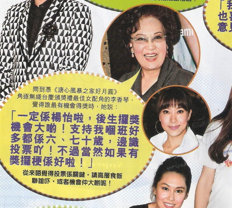今 年 她 在 台 慶 角 逐 兩 個 獎 項 , 她 說 : 「 其 他 人 都 開 心 , 但 我 唔 會 讓 賽 架 , 想 晒 , 有 得 就 。 」