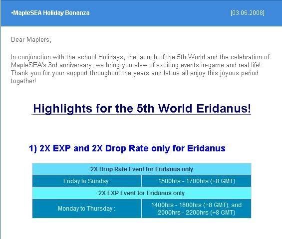 MapleSEA will be having a 2X Drop Rate for the month of June! For all the worlds, the 2X Drop Rate will start from 1st June to 30th June 2008.