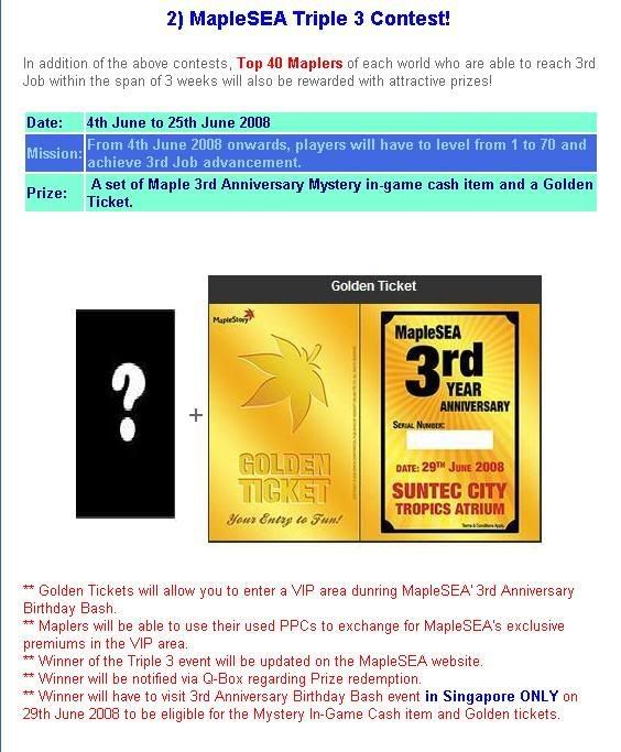 Please be informed that there will be a Game Client Patch and Server Maintenance for MapleSEA on the 4th June 2008, from 0100 hrs to 1000 hrs (+8 GMT). The Game Service will be down during this period. Please logout before this time to avoid any loss of items.
