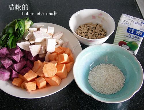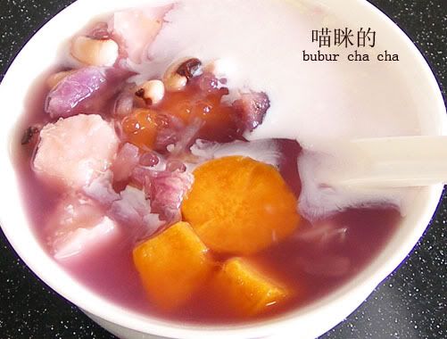 是啊。。。一直很喜欢紫色的地瓜,很绵,颜色很有情调 从小喝的bubur cha cha都有眉豆的,所以我也加了 |