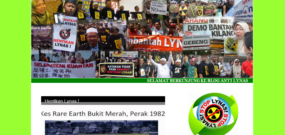 [Kepada mereka yang mempunyai bahan-bahan penting untuk dipaparkan ke dalam blog berkenaan. Agak menghairankan bila mana mereka yang tinggal di Kuantan dan sekitarnya masih belum faham atau ambil berat isu ini. Malah, peratusan orang Melayu yang peka kepada bahaya radiasi yang akan dikeluarkan oleh kilang tersebut amatlah rendah. Mungkin dek kerana media arus perdana berbahasa Melayu yang berterusan untuk menutup cerita sebenar tentang itu ini. Hanya Sinar Harian dan akhbar berbahasa Cina yang dilihat lebih peka dengan memaparkan isu sebegini. Lantaran itulah kita tidak hairan kaum Cina lebih ramai berjuang untuk menyelamatkan generasi akan datang dalam isu Lynas sebenarnya]. |