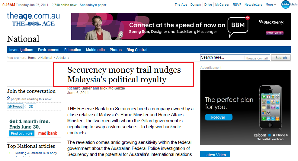 Memang agak mengejutkan bila mana Menteri Dalam Negeri Datuk Seri Hishammuddin Hussein menafikan laporan akhbar Australia yang mendakwa adiknya dibayar untuk menjayakan kontrak kerajaan dengan syarikat negara kiwi itu. Bercakap kepada pemberita semalam, beliau mendakwa tidak tahu menahu mengenai kegiatan Haris Onn Hussein. " ertama sekali, saya tidak tahu menahu apa adik saya lakukan. Keduanya, saya tidak rasa bahawa (syarikat) Australia akan melakukannya," katanya. Ditanya sama ada beliau menafikan semua dakwaan dalam laporan itu, Hishammuddin berkata: "Itu yang saya katakan. Ya." Menurut akhbar The Age yang itu semalam, Securency iaitu firma teknologi kewangan yang mengupah Haris pada 2009 untuk mendapatkan kontrak di Malaysia. "Securency mengupah Haris Onn Hussein dengan harapan beliau akan menawarkan harapan untuk membolehkan mereka akses kepada, dan mempengaruhi, ahli politik tertinggi Malaysia," laporan itu dipetik. Pada masa kejadian tersebut, Hishammuddin merupakan Ketua Pemuda UMNO dan Menteri Belia dan Sukan.