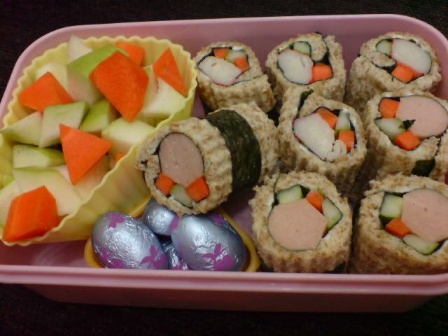 面包寿司卷便当, 做的比那本食谱来的漂亮哦。旁边那个是番石榴吗??