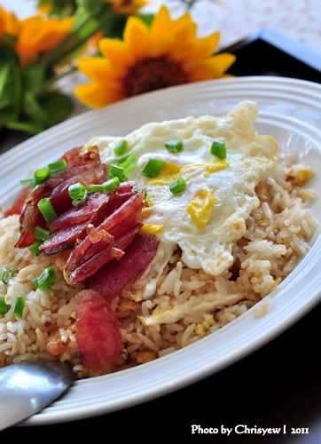 材料 - 隔夜米饭,上等虾米洗净(炒出来比较香),腊肠,鸡蛋打散一个,煎荷包蛋一个,蒜米,调味(酱油 胡椒粉)