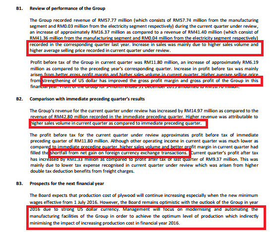 1. Revenue of RM 50.13 million for FY2015 Q2 included sales NOT recognized in FY2015 Q1 due to delay of arrival of vessel to USA (as highlighted above). The sales brought forward to FY2015 Q2 is projected at RM 8 million. Without that one-off sales, the revenue for Q2 is only RM 42 million.