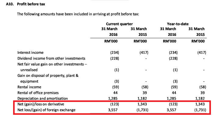 3. Net gain on foreign exchange/derivatives was RM 1.15 million in FY2015 Q2. Any one-off gain should be excluded from the calculation of core profit.