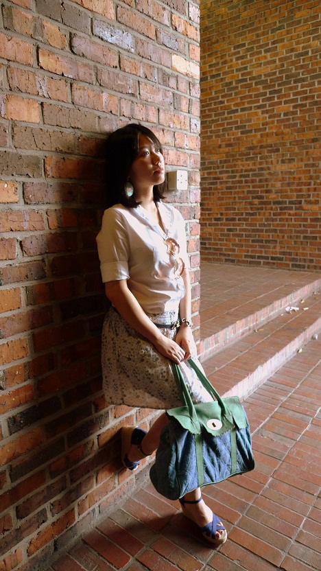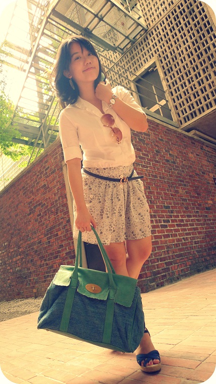 一件白衬衫,一件碎花短裙,一双蓝色楔型鞋,