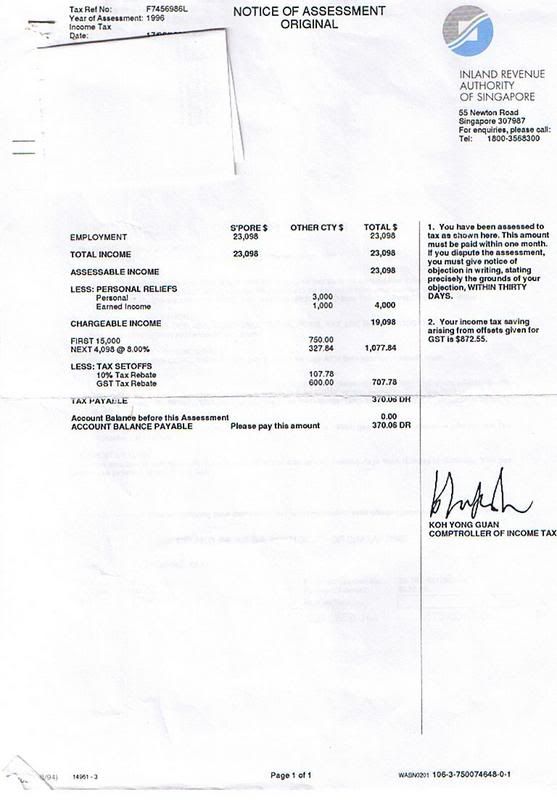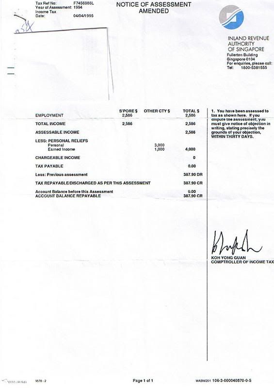而在96年的所得税95呈报后,证明我95还留在新加坡,所以有关抽税的$387退回给我!