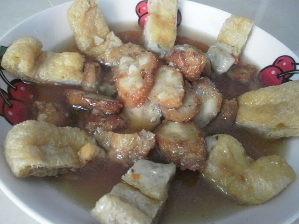 做法:1.把豆卜釀跟鸡卷过油煎熟,摆好放在碟中.