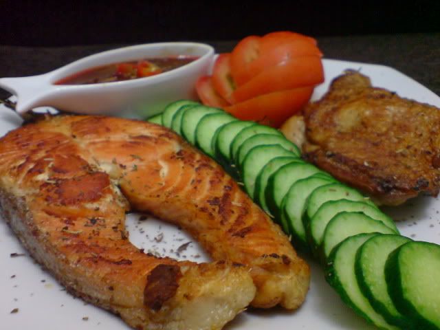 鱼扒鸡扒一扒 三文鱼 鸡腿肉 连盐都不放 就这样无油煎熟 因为 三文鱼会自己出油 鸡腿皮也是会 ... 38隐形人 发表于 18-9-2010 12:02 AM