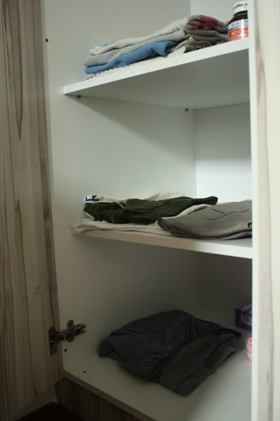 以前旧家的wardrove,是家私店老板“设计”给我的,他帮我弄了2个抽屉,其中一个可以锁。反而这次定做的,我和老公都懵懵懂懂,忘了说要有抽屉,结果只有shelve而已。这是我的疏忽。 |